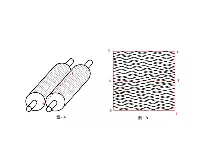 如果经过AB虚线,作出一个与大豆运行方向相一致的垂直面CDEF,就得到如图-3所示的形态。再将快、慢破碎辊的圆柱表面都由外侧向中间展开,并且并入此垂直面,就形成了一个如图-5所示的“剪切面”。